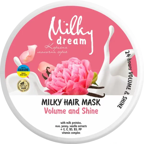 MILKY DREAM Plaukų kaukė „Apimčiai ir blizgesiui” su pieno proteinais 300 ml. Ploniems, išblūkusiems ir pažeistiems plaukams. Su pieno proteinais, rožių ekstraktais, vanilės bijūnais ir vitaminų E, C, B, PP kompleksu.
