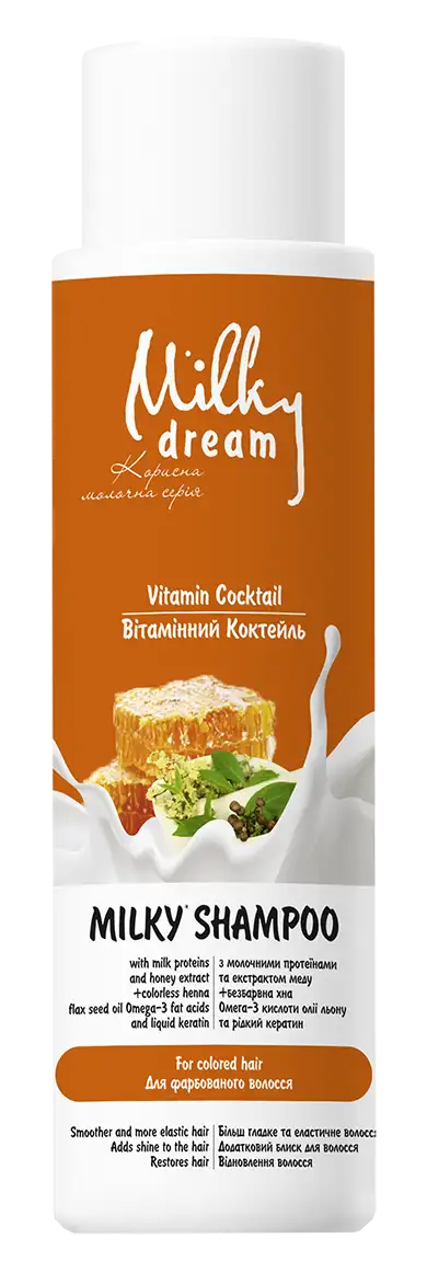 MILKY DREAM Kreminis šampūnas „Vitaminų kokteilis” su pieno proteinais 400 ml. Dažytiems plaukams.